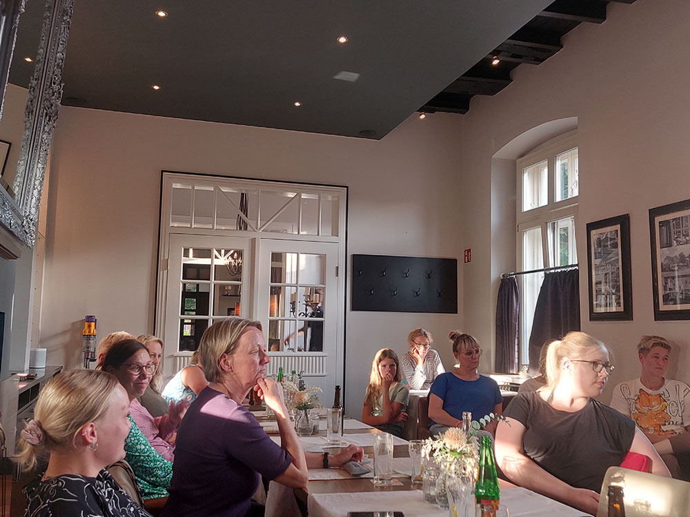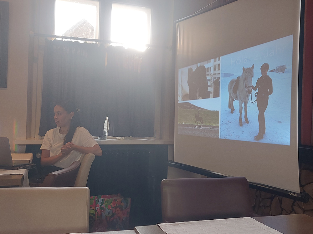 Unsere Freizeitwartin Anika hat sich mit vierzehn Teilnehmerinnen am 19.07.2024 in der Elmendorffburg in Vechta getroffen. Dort erzählte Anne Krishnabhakdi (B. Sc. Riding and riding instructions from Hólar University) über ihr Leben und ihre Erfahrungen auf Island. Sie gab uns tolle Einblicke zu verschiedenen Höfen in Nordwest- und Südisland, auf denen sie gearbeitet hatte. Das Thema Studium an der Universität Hólar durchleuchtet sie ausführlich und erzählte von der praktischen Arbeit mit den Islandpferden. Ihr Vortrag wurde durch wunderschöne Landschaftsbilder Islands und Reiterszenen begleitet. Es sind viele interessante Fragen gestellt und beantwortet worden. Die Stimmung unter den Teilnehmerinnen war toll. Beim leckeren Essen in der Elmendorffburg sind alle Teilnehmerinnen ins Gespräche gekommen. Wir bedanken uns auch noch einmal auf diesem Weg bei Anne für ein gelungenes Freizeitreitertreffen 2024!