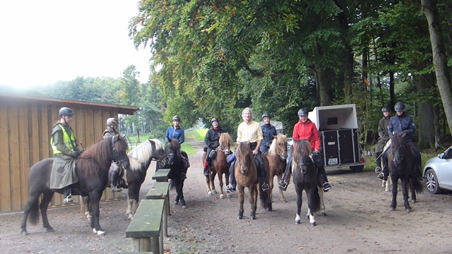 Eigentlich hatten wir schon mit zahlreichen Absagen gerechnet, aber Respekt: alle angemeldeten Teilnehmer waren gut gelaunt am Start. Anfangs war es auch nur etwas feucht in der Luft, aber wenn die Vorhersage auch oft irrt, nicht an diesem Tag: es dauerte nicht lange, da kam die volle Regenmontur zum Einsatz und wurde wahrlich einem Härtetest unterzogen. Aber wir wären ja keine „waschechten“ Islandpferdereiter, wenn wir das Wetter nicht einfach ausblenden könnten. Und so folgten wir unter Peter Simons Führung den vielen Waldpfaden und Wiesenwegen, genossen zwar keine weiten Ausblicke, aber dafür umso verwunschenere Nebel- und Wolkenansichten über dem Wiehengebirgszug und kamen feucht, aber in bester Stimmung im gemütlichen Speichercafé an, wo wir uns bei Kaffee, Kuchen und Schnittchen stärken und aufwärmen konnten.