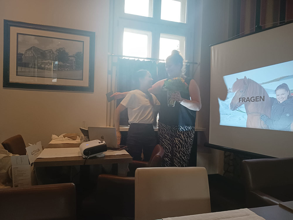 Unsere Freizeitwartin Anika hat sich mit vierzehn Teilnehmerinnen am 19.07.2024 in der Elmendorffburg in Vechta getroffen. Dort erzählte Anne Krishnabhakdi (B. Sc. Riding and riding instructions from Hólar University) über ihr Leben und ihre Erfahrungen auf Island. Sie gab uns tolle Einblicke zu verschiedenen Höfen in Nordwest- und Südisland, auf denen sie gearbeitet hatte. Das Thema Studium an der Universität Hólar durchleuchtet sie ausführlich und erzählte von der praktischen Arbeit mit den Islandpferden. Ihr Vortrag wurde durch wunderschöne Landschaftsbilder Islands und Reiterszenen begleitet. Es sind viele interessante Fragen gestellt und beantwortet worden. Die Stimmung unter den Teilnehmerinnen war toll. Beim leckeren Essen in der Elmendorffburg sind alle Teilnehmerinnen ins Gespräche gekommen. Wir bedanken uns auch noch einmal auf diesem Weg bei Anne für ein gelungenes Freizeitreitertreffen 2024!