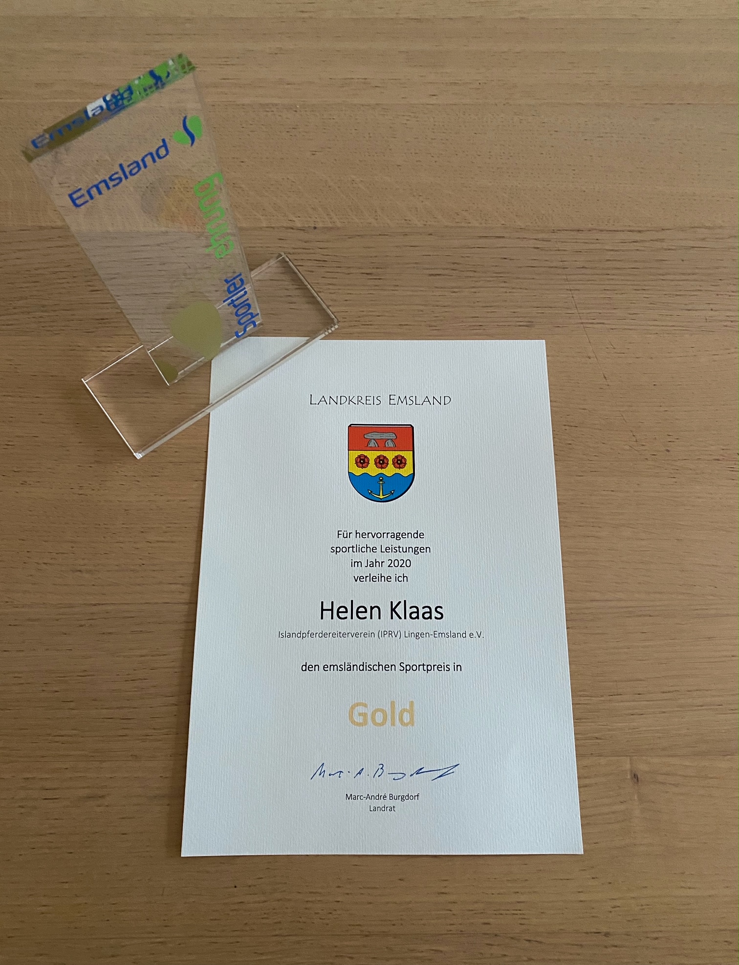 Helen wurde für ihre herausragenden Leistungen im Jahr 2020 mit dem emsländischen Sportpreis in Gold geehrt!